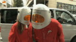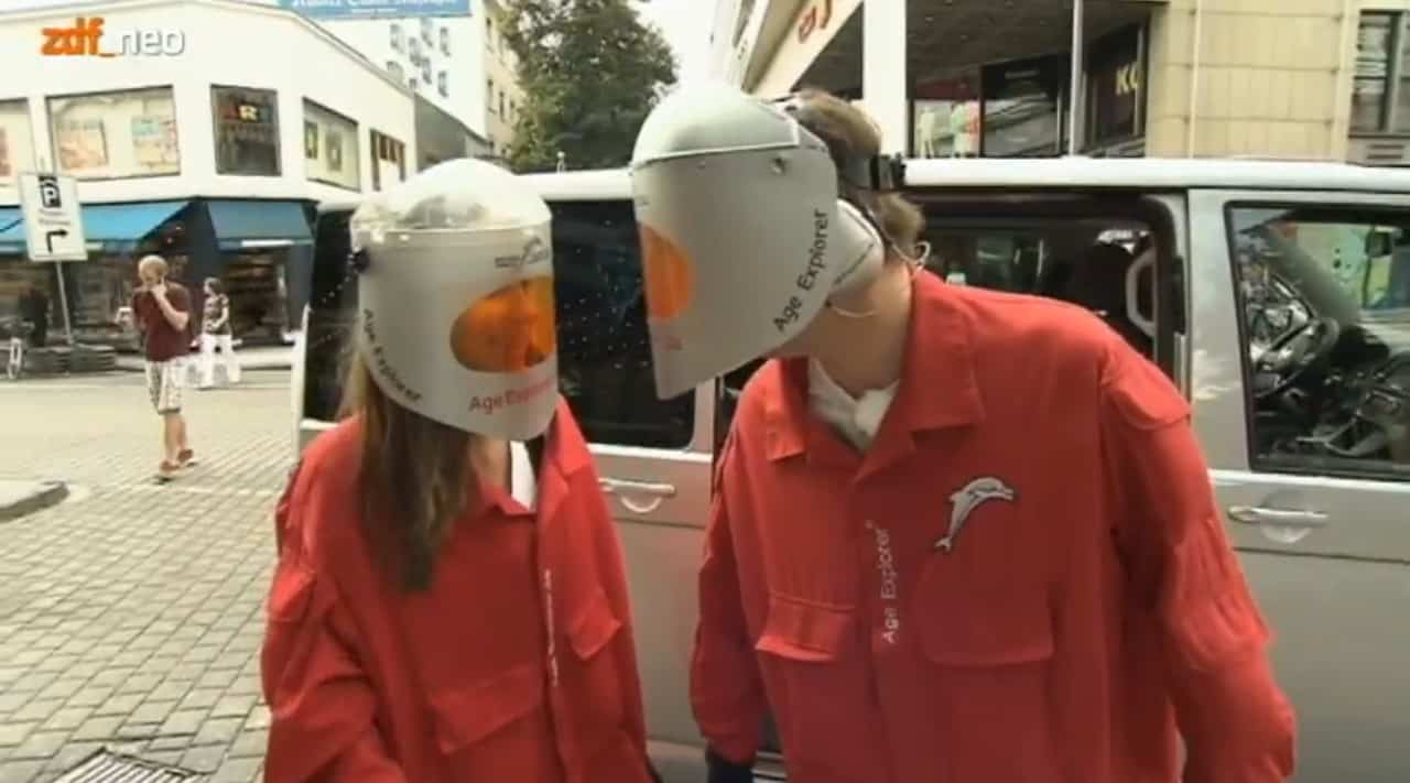 Lutz von der Horst und Christiane Stenger (Wie werd’ ich unsterblich? ZDF NEO) im Age Explorer Alterssimulationsanzug