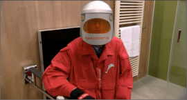 Anlässlich der Weltleitmesse ISH schlüpfte ZDF-Moderator Norbert König in den Altersanzug Age Explorer, um ein barrierefreies Bad zu erleben.